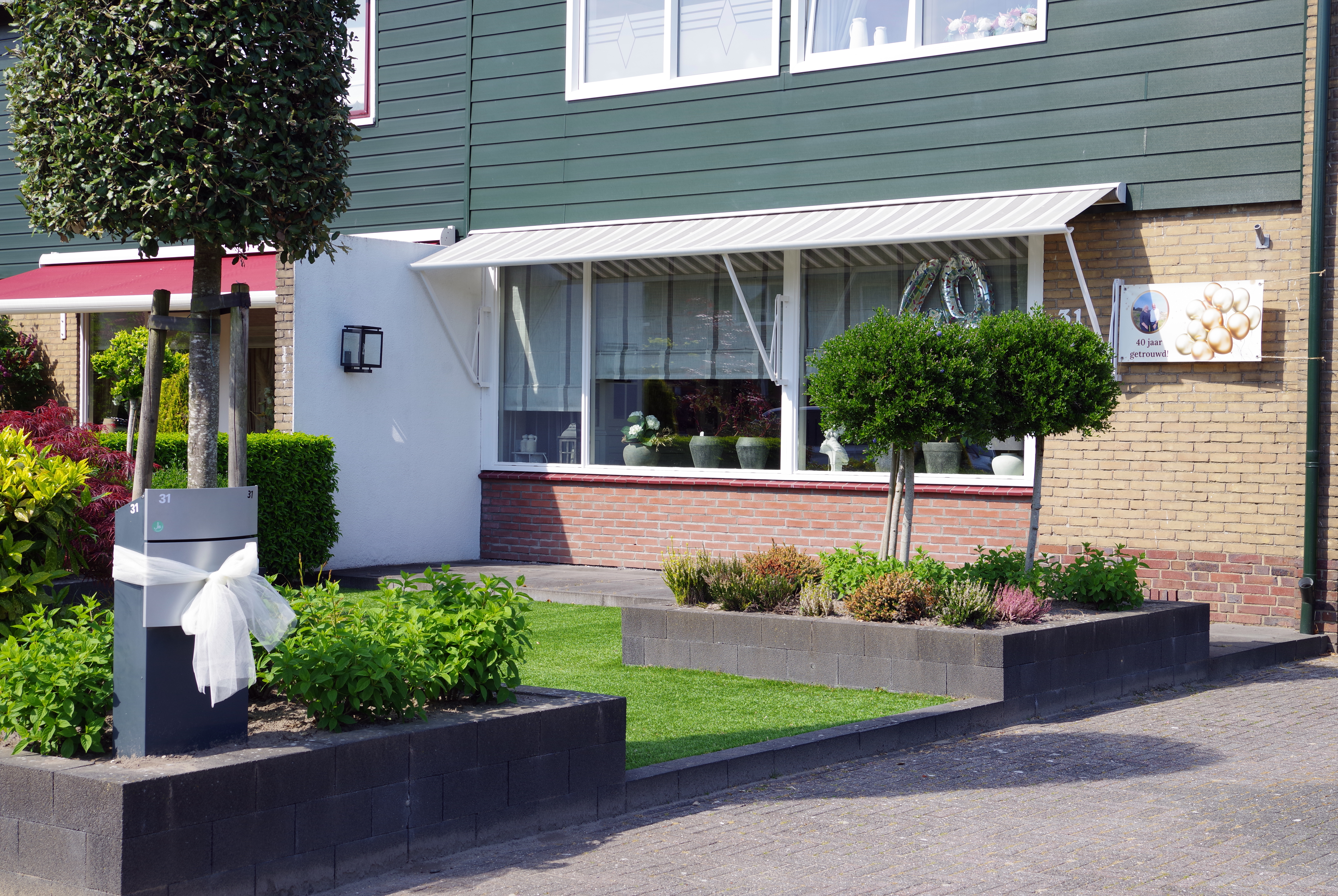 Gevel van woning nr. 31, opgefleurde met een melding van een 40-jarig huwelijk.